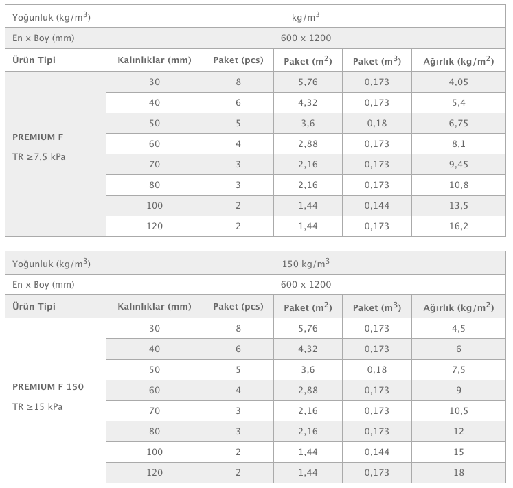 150 kg/m³ yoğunluğunda tek seri olarak üretilen PREMIUM F / F150 serisi sıvalı mantolama uygulamalarına özel üründür. Su itici özelliği ve yüksek yoğunluğu sayesinde, darbenin söz konusu olduğu alanlar için uygundur.